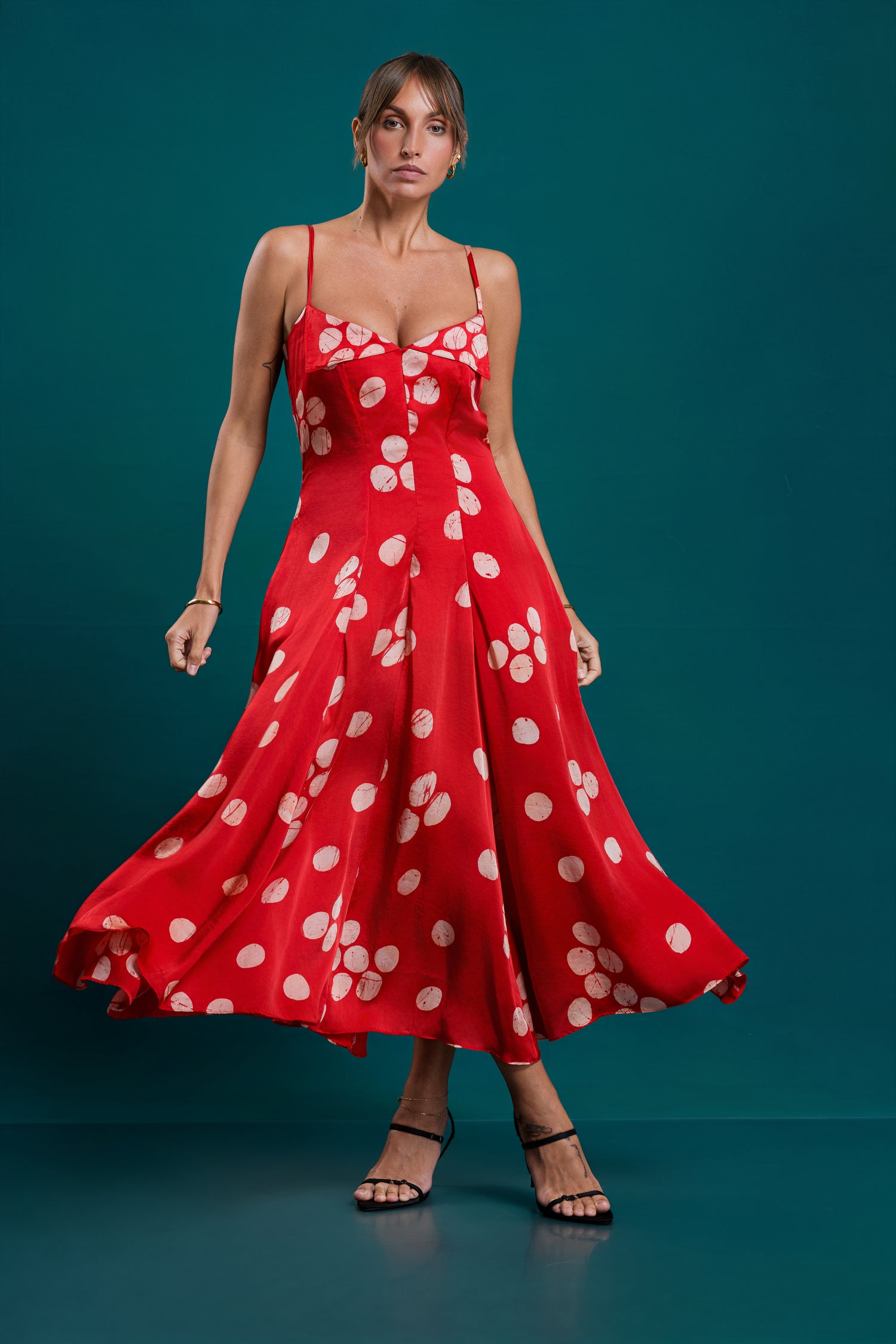 This Dressfeatures a vibrant red base adorned with playful polka dot detailing. Designed with delicate straps and a flowing silhouette, it offers effortless movement and festive elegance.