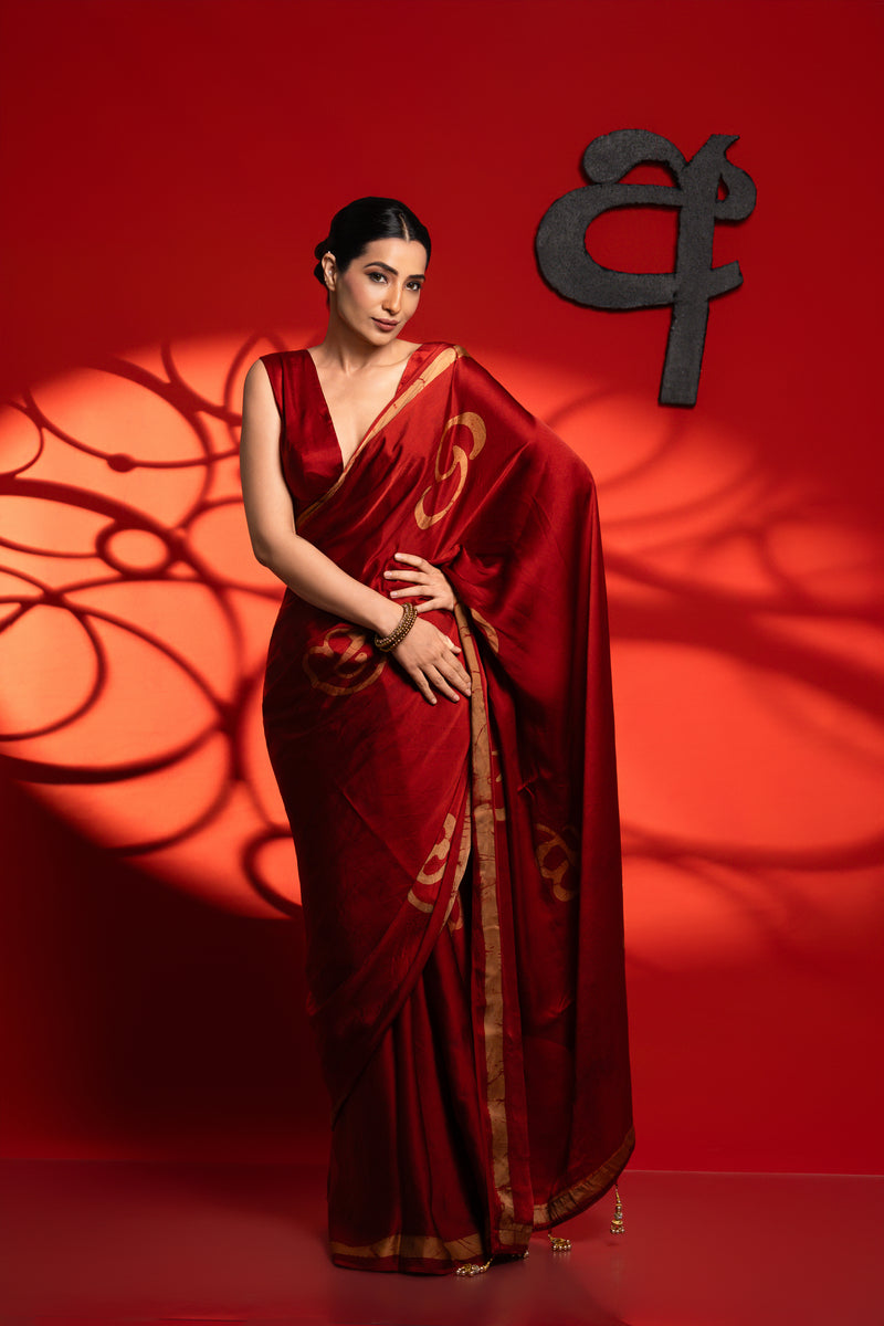 Draped in deep red and adorned with golden Sinhala letters, this saree celebrates language as an art form. Every curve and brushstroke is hand-drawn by Colombo Batik artisans, reflecting stories of heritage, devotion, and identity.