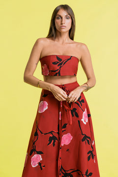 The Rosalia Red Wrap Skirt from Bloomstate – Festive Edit I features an asymmetric design with soft overlapping panels, adorned with rose-inspired batik motifs in vibrant green tones. The skirt wraps gracefully around the waist, offering adjustable comfort and fluid movement.