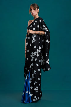 A striking statement saree crafted in a dual-tone palette, featuring blue on one side and black on the other, brought together with timeless polka dot detailing. Designed to stand apart, this saree blends classic charm with modern contrast — perfect for evenings that call for understated luxury.