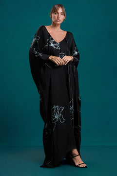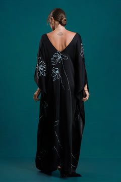 The Noir Black Rose Kaftan from Lumina – Festive Edit II features a deep black base adorned with striking skeleton rose artwork. Designed in a flowing kaftan silhouette, this piece blends artistic expression with effortless elegance.