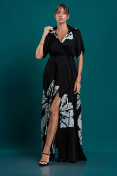 The Noir Wrap Shirt Dress from Lumina – Festive Edit II features a sleek black tone in a long, flowing wrap silhouette. Designed with a classic shirt-style structure and an adjustable wrap closure, this dress offers effortless elegance and versatility.