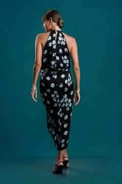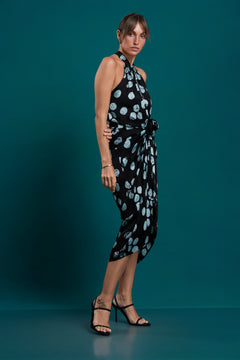 The Rosette Blue Knot Dress from Lumina – Festive Edit II features a playful polka dot print with a stylish knot detail at the front. Designed in a flattering mid-length silhouette, this dress combines comfort, movement, and festive charm.