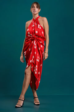 The Rosette Red Knot Dress from Lumina – Festive Edit II features a playful polka dot print with a stylish knot detail at the front. Designed in a flattering mid-length silhouette, this dress combines comfort, movement, and festive charm.