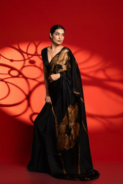Mandara is a floral extravaganza in black silk adorned with large golden blooms and delicate sequin detailing. This saree blends artistry and luxury, perfect for evening events, weddings, or gala celebrations.