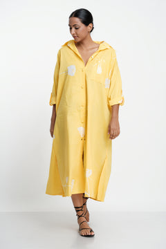 The Pale Bloom Shirt Dress features a gentle pastel yellow base accented with delicate white rose motifs.