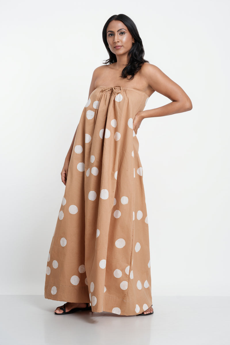 The Sand Dot Tube Dress features a soft beige base adorned with crisp white polka dots, offering a refined take on a classic print.