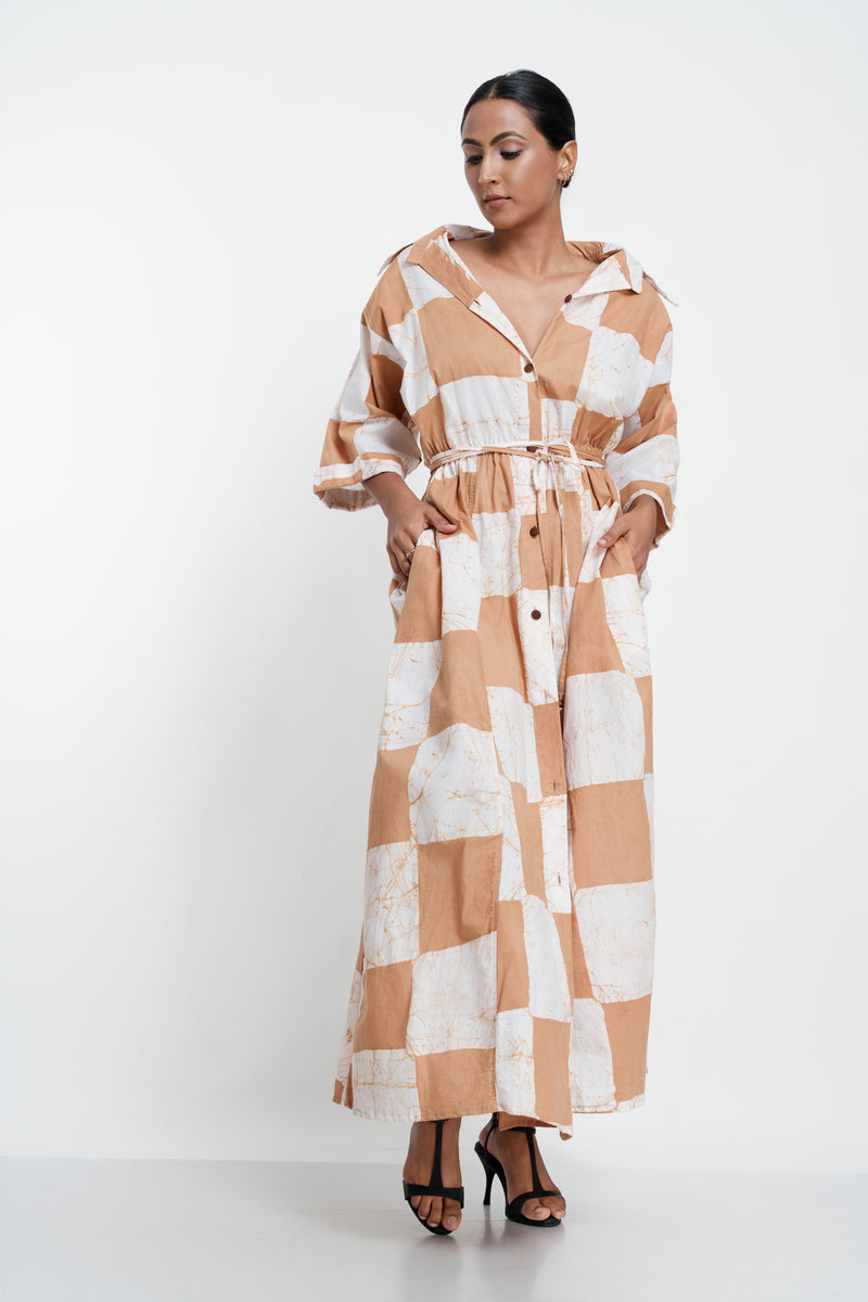 The Sand Grid Shirt Dress blends beige and white in a clean square motif, creating a look that feels structured yet soft.